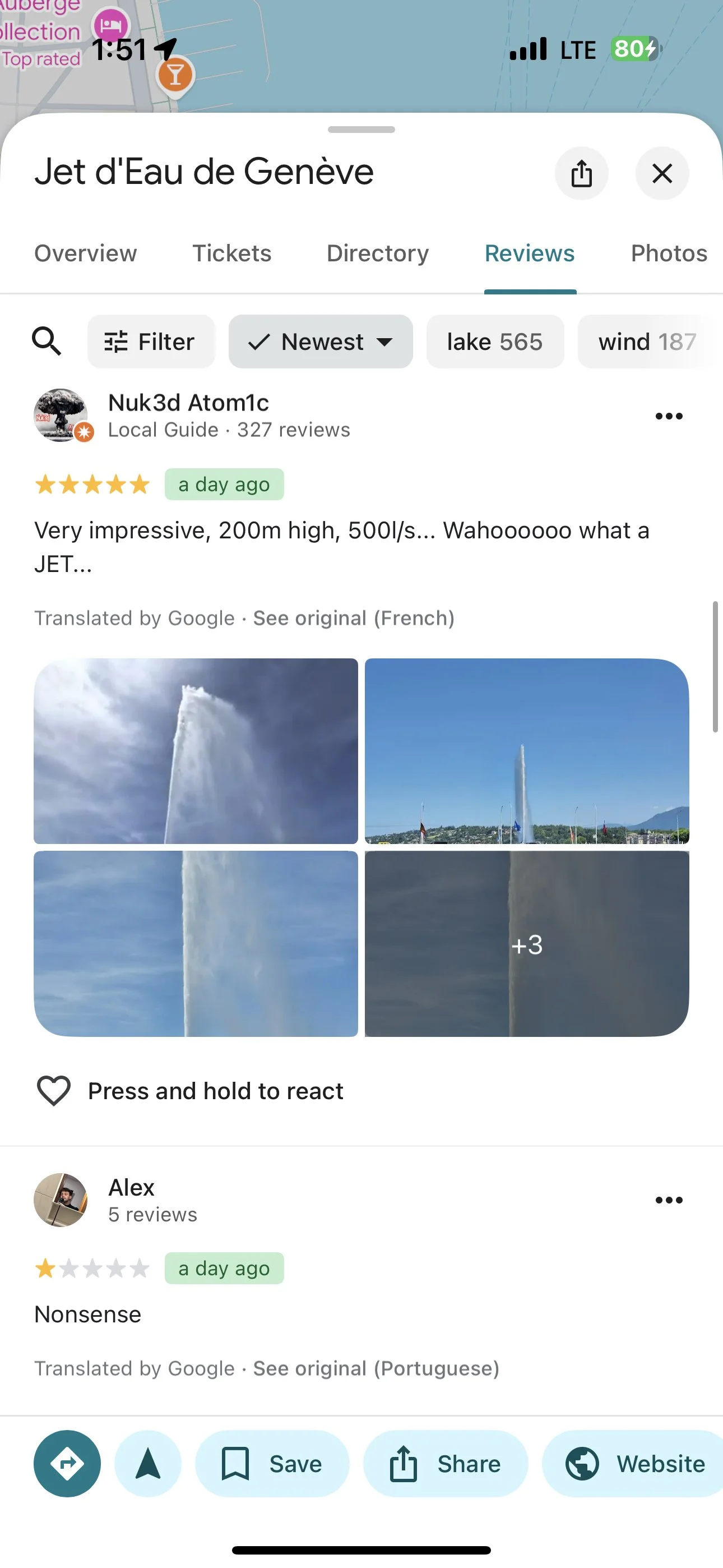We only had half a day in Geneva, but ever the maximizers, we squeezed a lot in. First, of course, we visited their landmark Jet d'Eau. This is the funniest set of back-to-back Google reviews I’ve ever seen:
